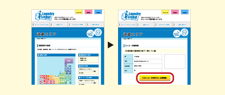 する必要があります。 ページ右下にある「設置エリア検索へ」ボタンよりロッカーを検索していただき、 詳細ページ内にある「このロッカーを利用する」ボタンを押して、会員登録にお進みください。